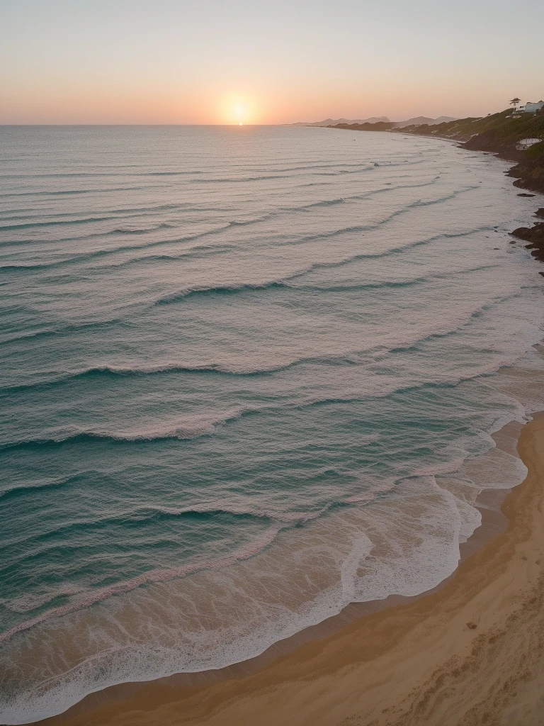 Uma vista serena da praia ao pôr do sol, ondas calmas tocando a areia, céu tingido de tons rosa, roxos e laranjas, silhuetas de pessoas caminhando na praia, evocando paz e contemplação, Pintura, tinta acrílica em tela, --ar 16:9 --v 5