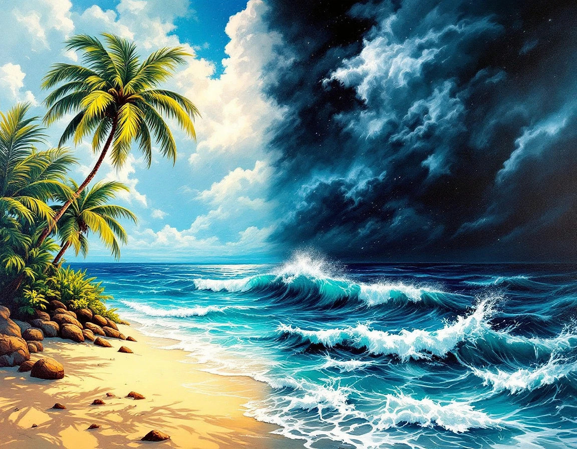 A surrealist painting with a seamless blend of two contrasting weather scenes. One side depicts a vibrant Caribbean day—turquoise waters, golden sand, palm trees swaying gently under a bright blue sky. The other side transitions fluidly into a dark, stormy seascape with churning waves, heavy ominous clouds, and wind-whipped trees. There is no visible divide; the shift in mood and weather is gradual and dreamlike, as if nature is quietly shifting between serenity and chaos. Hyper-detailed, oil painting style with rich textures and soft, surreal lighting.