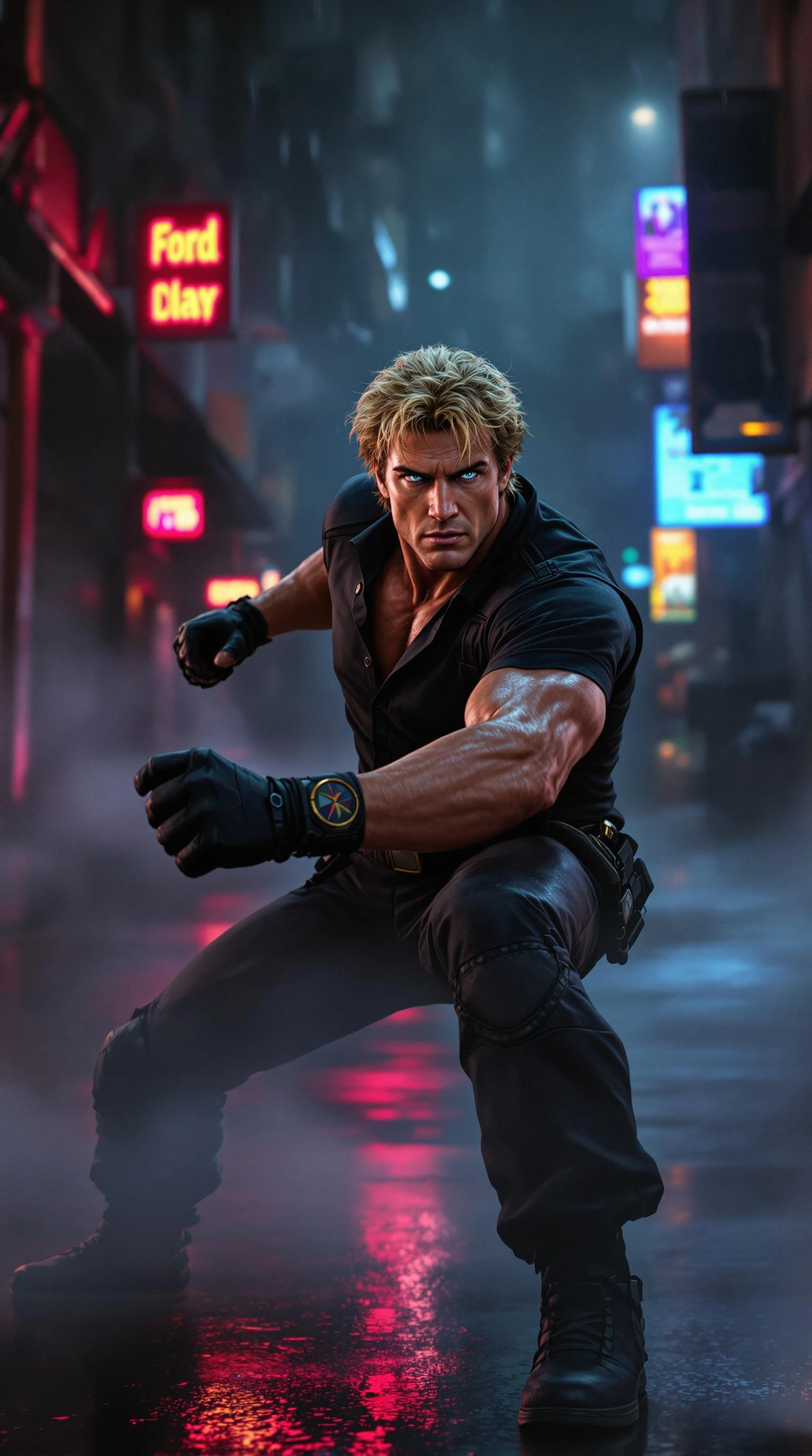 A hyperrealistic 1980s-style cinematic scene featuring Michael Dudikoff as the iconic American Ninja in a dynamic and action-packed combat pose. Michael Dudikoff is depicted with his signature 80s action-hero features: sharp, angular facial features with a chiseled jawline and high cheekbones, paired with his distinctive, slightly windblown, sandy-blond hair—a hairstyle that was emblematic of his role in American Ninja. His piercing blue eyes exude a cool, confident, and battle-hardened intensity, with a steely, focused expression that conveys both experience and readiness for combat. His face is rugged yet refined, a perfect blend of action hero charm and martial arts precision. Michael Dudikoff is wearing his iconic 80s-inspired tactical ninja outfit: a sleek, black, tactical shirt and matching black combat pants designed with practical elements like reinforced padding and a combat-hardened, military-inspired aesthetic. His outfit is tight-fitting enough to emphasize his powerful, athletic frame, highlighting his muscular physique while retaining his mobility and combat agility. The fabric appears weathered but functional, reflecting the American Ninja's life of training and combat. His shirt features subtle, well-defined folds that capture movement as he is posed in mid-action. His hands are gloved, practical and battle-worn, with individual fingers that exhibit visible veins, musculature, and precise anatomical form—symbolizing his mastery of martial arts combat. The background is a gritty, atmospheric 80s-style urban combat environment—dimly lit with glowing neon lights reflecting off slick, rain-soaked pavement. The mist from the neon lights swirls through the scene, creating a striking interplay of reds, blues, and purples as ambient lighting cuts through the foggy air. Retro urban elements like rusted metal, old warehouses, neon billboards, and shadowy alleyways frame the scene, emphasizing the American Ninja's ominous and heroic presence within a classic retro action movie aesthetic. Volumetric lighting highlights Michael Dudikoff's well-defined musculature, sharp facial features, and poised combat stance, with sharp beams cutting through the smoke to spotlight his silhouette. His battle stance is powerful, with legs positioned for swift, calculated strikes and arms drawn in a poised martial-arts-ready posture. His body exudes strength, discipline, and precision, evoking his reputation as one of the 80s most iconic action heroes. Every detail is rendered in stunning hyperrealism—the texture of his tactical shirt, the sheen of sweat reflecting off his muscular arms, the glint of his combat gear under the ambient neon lights, and the sharp reflections off wet surfaces. The scene captures the essence of 1980s action cinema and American Ninja's signature blend of martial arts mastery, heroism, and intensity—a retro-futuristic masterpiece that showcases Michael Dudikoff's charisma, iconic fighting style, and classic 80s action appeal.
