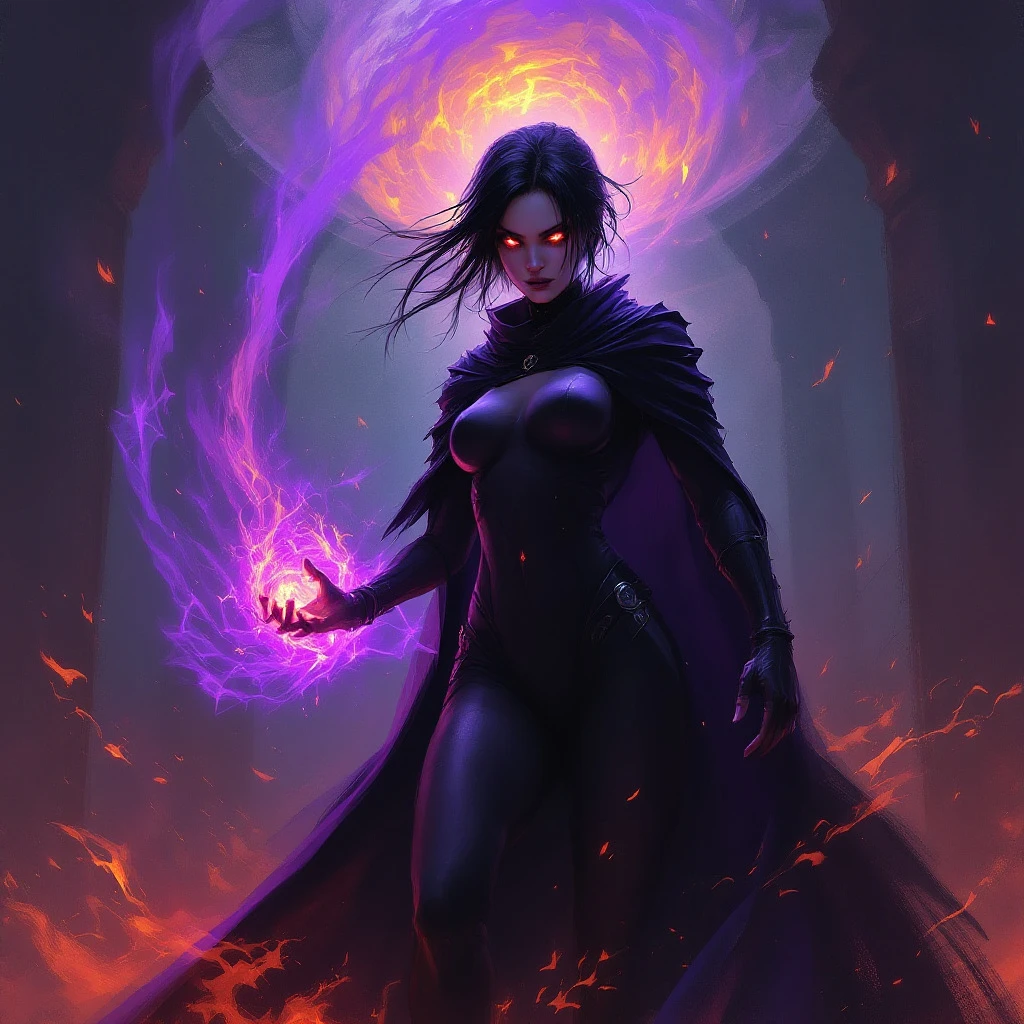 simple blurry brush digital painting in the style of warhammer 40k of a female psyker, standing infront a gothic circh, channeling pruple and orange hellfire magic, cybereyes, black tight onepiece suit, mantle with high collar, black hair