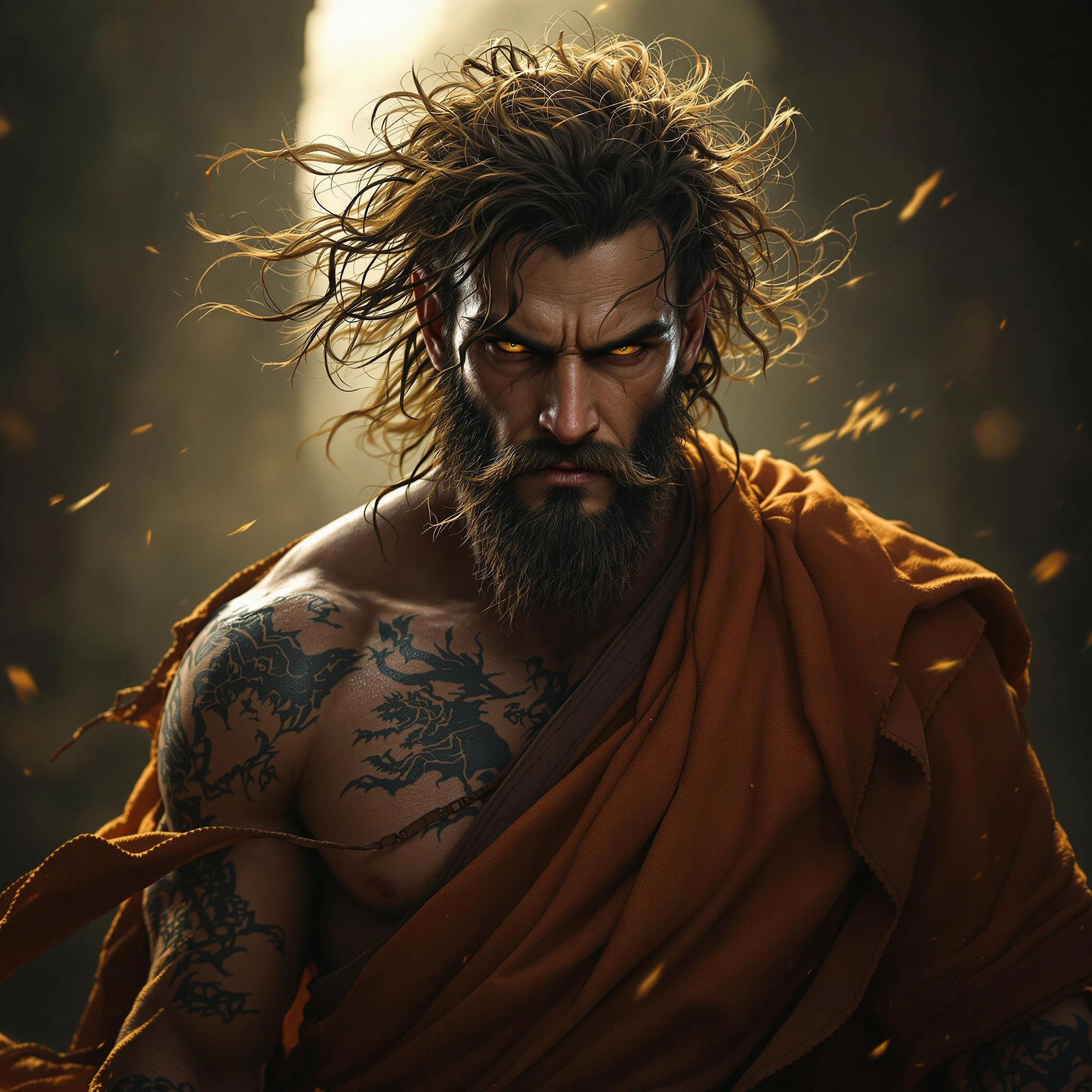 Photo of a ultra realistic portrait, dramatic light, middle aged male satyr, tan skin tone, curly brown hair, cinematic lighting, wind blown monk robes, 4k, hyper realistic, focused, extreme details, tattoos, fighter, masterpiece, fantasy art, dungeons and dragons, character art