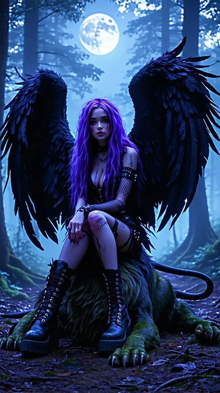 A full body shot of a strong, fierce black lion, its fur with a slight blue tinge, and large outstretched black feathery wings with intricate glowing details. A punk rock woman with long flowing deep purple hair wearing combat boots, gothic style clothing with fishnet detailing, and dark bold makeup, sits on its back. Dark, moody, forest backdrop, large, thick shadowy trees, thick fog, full moon, galaxy of stars. Highly-detailed, photo-realistic, detailed texture, deep violet, glow, deviantArt, perfect composition, masterpiece, glittering, professional photography, dramatic lighting, 8k, sharp focus, ethereal, dark fantasy, moody lighting, ultra-realistic, bold vibrant colours