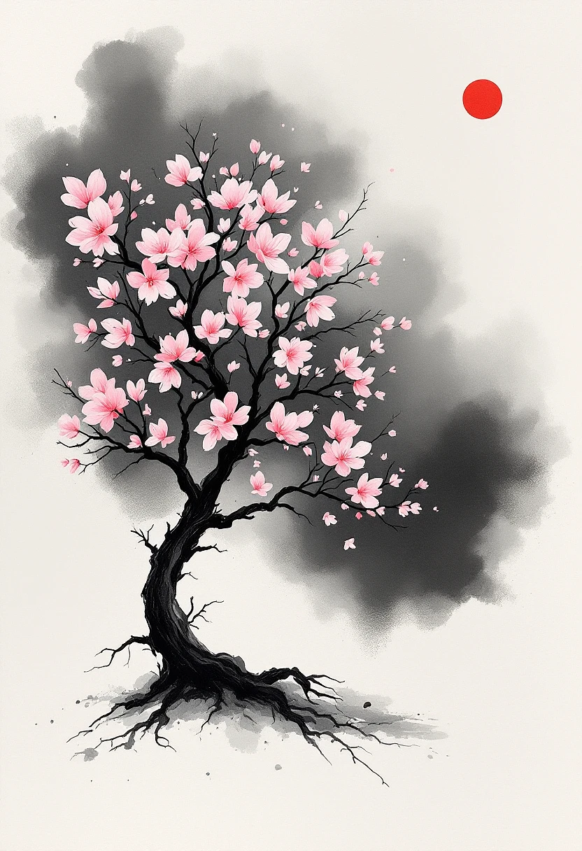 Abstract ink wash painting, inspired by a lone, stylized Japanese tree with delicate pink cherry blossoms, flowing black ink forming the branches and trunk, hazy white mist in the background, a single bold red circle near the horizon, textured paper
