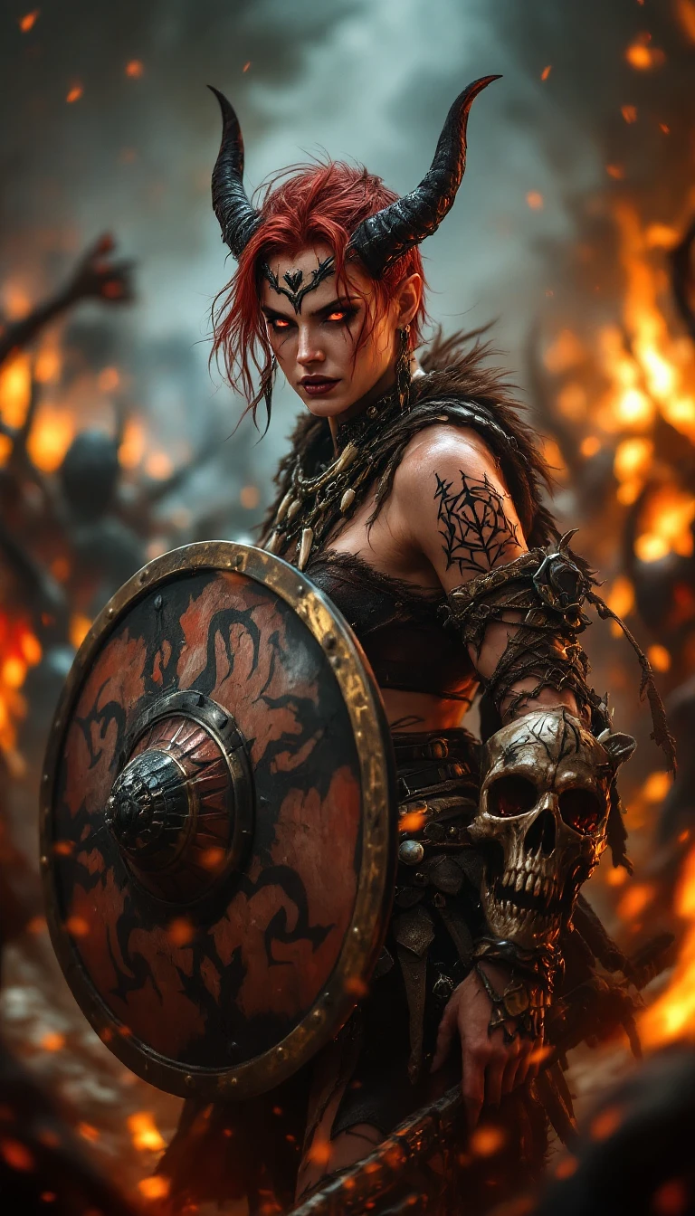 The Demonic Shield Maiden: A fierce and resilient warrior with short, vibrant red hair styled in a practical, almost barbaric way, often adorned with demonic horns, bone jewelry, and tribal markings, and her expression is both fierce and resolute. Her eyes are piercing, a fiery red that seems to burn with both rage and demonic power. She wears practical leather armor reinforced with metal and demonic sigils, with bone and demonic charms, and she carries a heavy shield with her clan's emblem and a demonic skull, and her very presence inspires fear and power. She stands on a battlefield, surrounded by demons and the echoes of battle, where the lighting is chaotic and intense, with hellfire and smoke creating a terrifying atmosphere. Her expression is determined and unwavering, with a deep connection to both her people and the demonic powers that she wields. She defends her people with her strength and her infernal power and channels demonic energy through her shield and her body. Her design is a powerful blend of demonic and Norse mythology with a touch of comic book action.