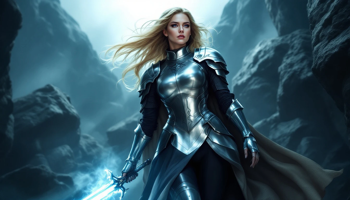 The image depicts a woman in a fantasy setting, dressed in armor and holding a glowing sword. The woman has long, flowing blonde hair that appears to be blowing in the wind. Her attire consists of a suit of armor that is predominantly silver in color, with a high collar and a decorative design on the chest. She wears a flowing skirt or cape that is a darker shade of silver, and her sleeves are long and fitted. Her hands are clad in silver gauntlets, and she holds a sword in her right hand. The background of the image is dark and misty, with large rocks or boulders visible in the distance. The lighting is dramatic, with a bright light shining down on the woman from above, casting a glow over her armor and sword. The overall effect is one of power and strength, as if the woman is a warrior or a hero in a fantasy world.