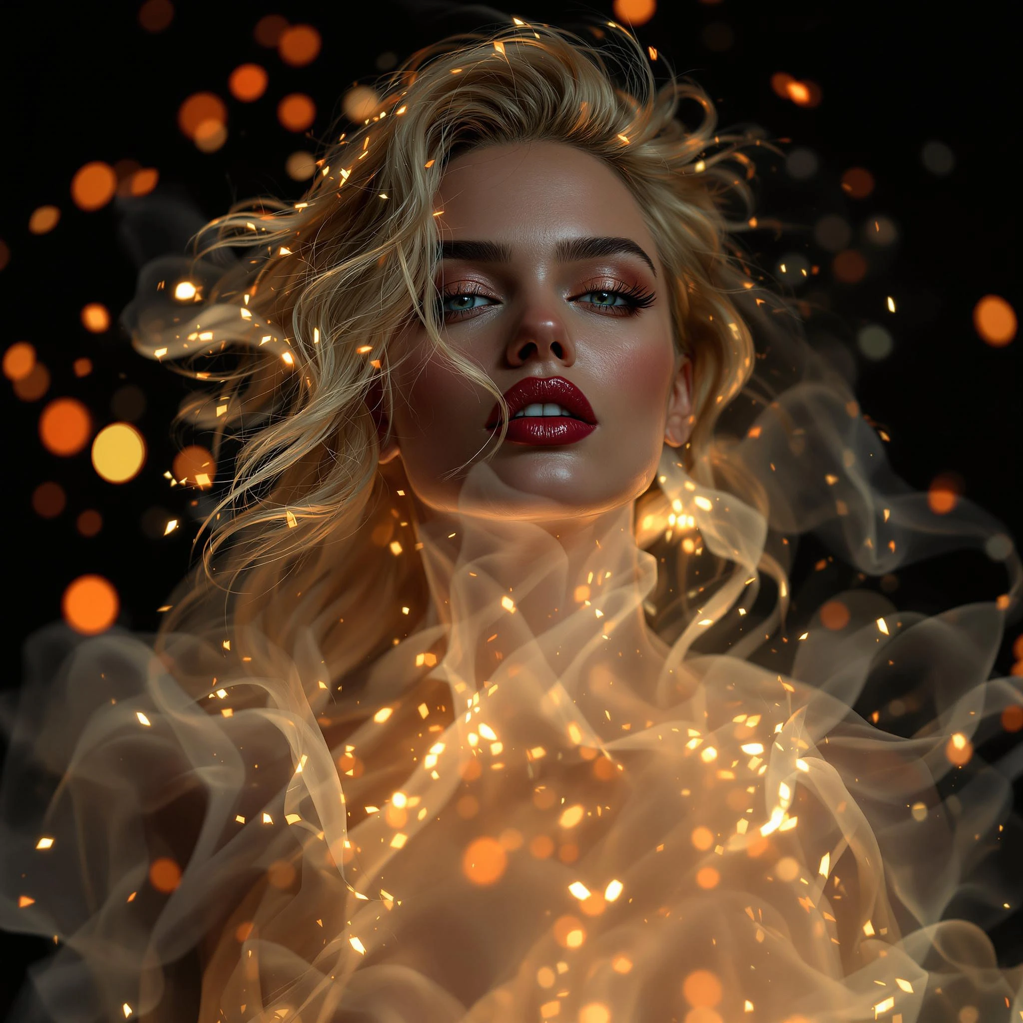 Margot Robbie, ((incorporeal) ) ghost, surrounded by glowing fog, black backdrop background, dynamic portrait, hyperrealism, highly detailed RAW color art, bokeh