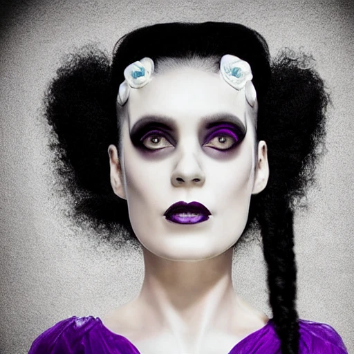 a vibrant professional studio portrait photograph of bride of frankenstein, black hair with a large white streak, goth, attractive, friendly, casual, delightful, intricate, gorgeous, female, piercing purple eyes, wears a silver necklace, femme fatale, nouveau, curated collection, annie leibovitz, nikon, award winning, breathtaking, groundbreaking, superb, outstanding, lensculture portrait awards, photoshopped, dramatic lighting, 8 k, hi res