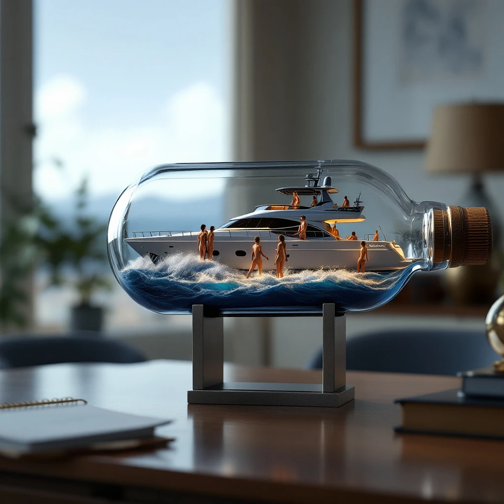 A realistic ship in a bottle, featuring a ((2005 68 foot Lazarra enclosed fly bridge) ) luxury super yacht scene. The yacht is busy with a few naked people on deck. The yacht name "Sweet Emoean" is visible on the side. The scene includes cresting waves, capturing a vibrant, dynamic moment. The bottle sits on a stand as a decoration on a professional-looking desk in a well-appointed home office. Highly detailed, ultra-realistic, cinematic, 8k. Negative prompt: text, logos, watermarks, out of frame, ugly, extra limbs, extra hands, extra feet, extra fingers, bad anatomy, blue hull