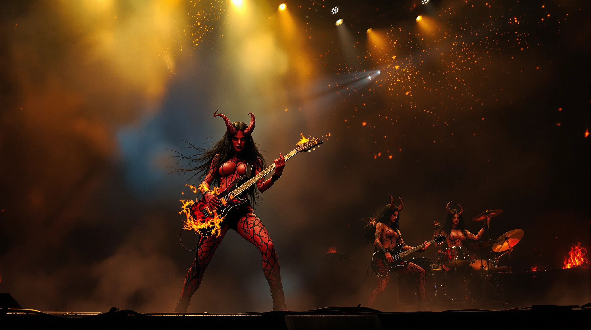 A wide-angle concert scene, reminiscent of Beksiński's dark mysticism and Giger's biomechanical nightmares, with Wood's gritty atmospheric sensibilities. Four demonic female performers command the stage - a lead singer at the microphone with fierce presence, a guitarist wielding a burning hellfire guitar, a bassist weaving dark rhythms, and a drummer unleashing infernal beats. The stage is bathed in Kodak Ektar-inspired warm golden tones and ambient blue-red lighting, with atmospheric fog and ember sparks dancing through the air. The band members share the same aesthetic: athletic physiques, red snakeskin pattern bodypaint, long black hair, and curved horns. The scene captures the majestic cinematic composition of Ash Thorp, while Roger Dean's lighting techniques illuminate the dramatic performance. The stage itself seems alive with hellish energy, as if the concert has transformed into a ritualistic gathering of ancient powers.