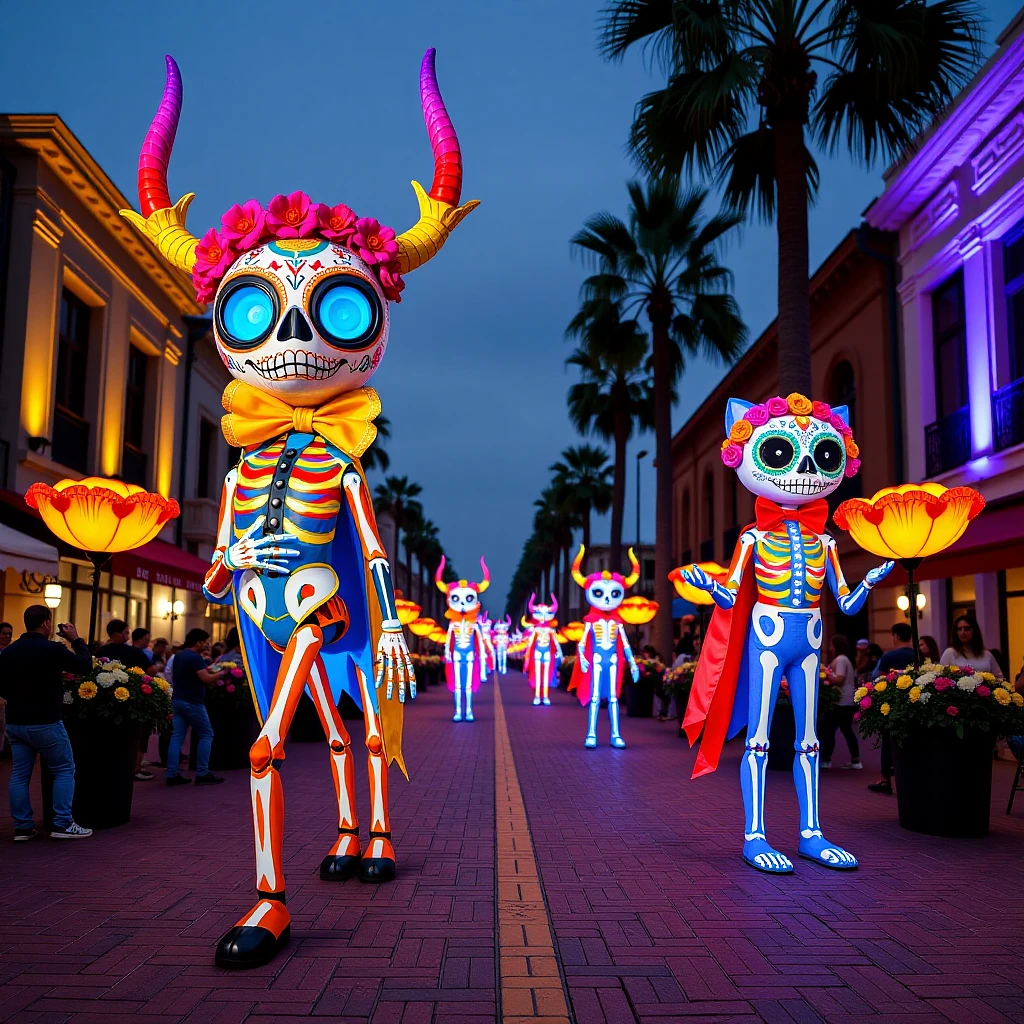 "Día de Muertos in Mexico, reimagined with colossal, spirit animal alebrijes parading through streets lined with giant, glowing cempasúchil flowers leading to the spirit world. "​​​