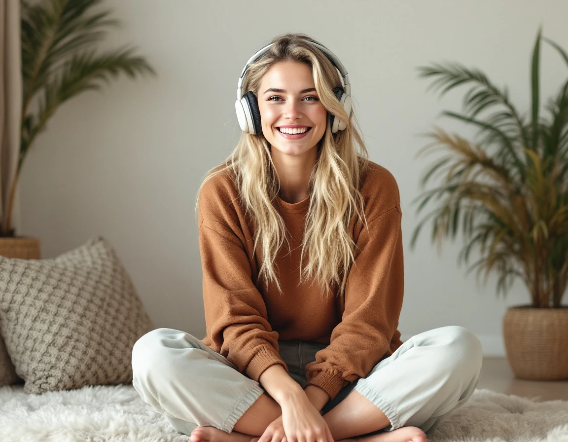 woman sitting cross-legged, nordic , blonde, Freckles, wearing headphones, looking happy and cheerful , smiling , relaxed. She is dressed in stylish clothes that complements her figure, with soft lighting highlighting her features. The background is minimalistic, enhancing the focus on her joyful expression and casual pose. The scene conveys a comfortable, warm atmosphere, with a slight glow on her skin.