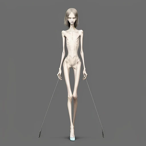 a needle-thin anorexic girl with skinny long legs and long skinny calves in high heels with long hooked claws, naked