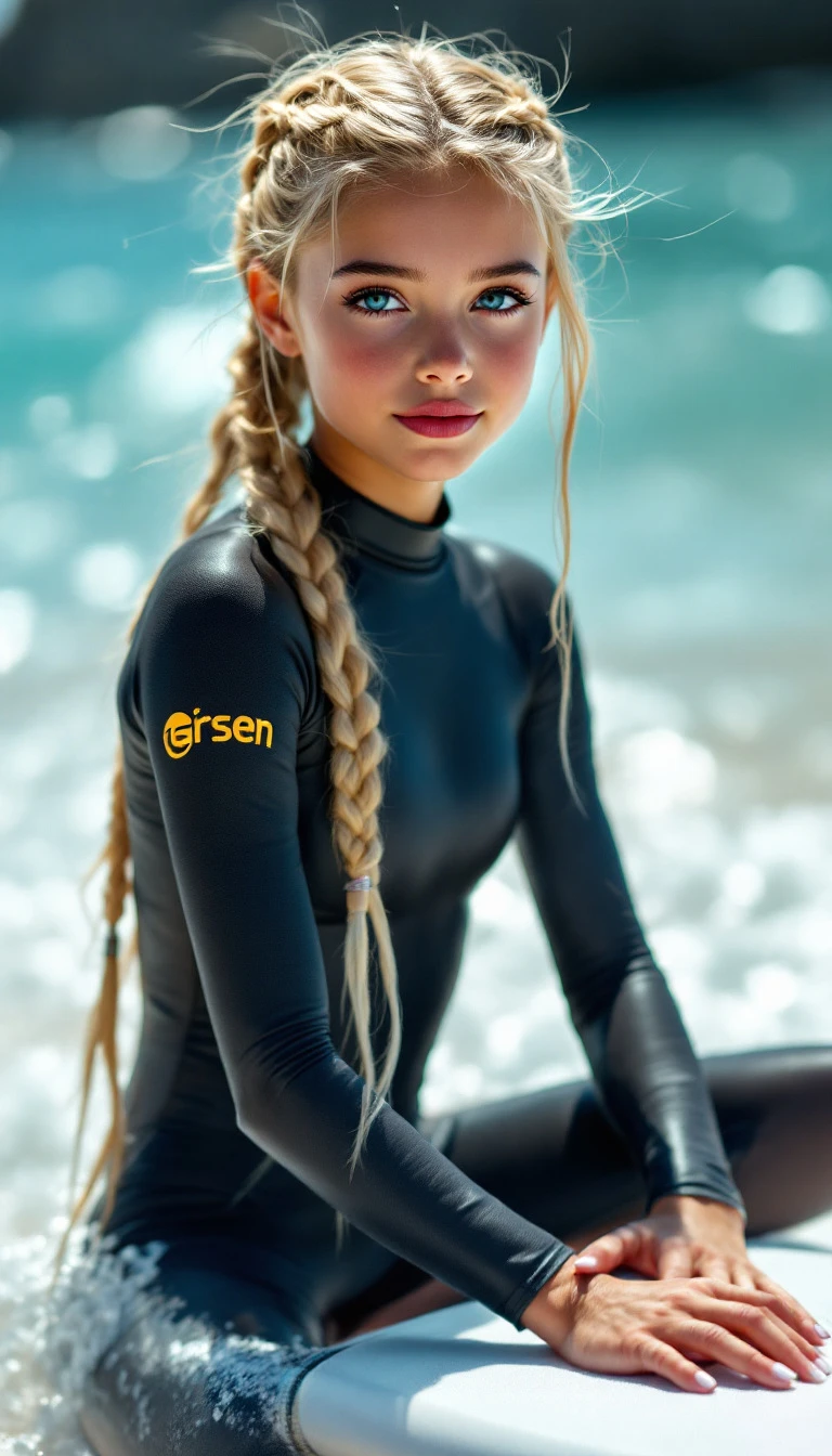 a professional photo of a exceptionally beautiful girl in the world (age 11) , (eleven year old) , at the beach, highly detailed, futuristic, (futuristic) , (masterpiece) , (realistic) , (perfect anatomy) , (Full body view) , (viewing from head to knees) with extremely long hair blonde braided hair in a tight ponytail, pulled back in to a ponytail, beautifully flawless olive skin, thick black eye liner, extra long eye lashes, light pink blush, extremely beautifully shaped lips with light red lipstick, light purple eye shadow, perfectly flawless olive skin, beautiful perfect high cheekbones beautiful perfect high cheekbones extremely detailed large perfectly shaped beautiful brilliant Forest Tea blue-brown-red-golden-grey-purple eyes, beautifully manicured fingernail with pink polish, (dressed in a wet-suit) , sitting on her surf board next to the ocean, high depth of field, gentle expression, 8k, (high res) , ultra-detailed, photo-realistic, full image view, full body view, front view, highly detailed, volumetric, dramatic lighting