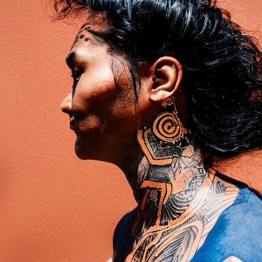 hyper realistic photograph, portrait of a tattooed southamerican indigenous black woman, future punk, gold tattoo line, side profile, summer, dramatic light, looking down Leica Q2, f1. 7, golden hour —ar 3:2—test --upbeta