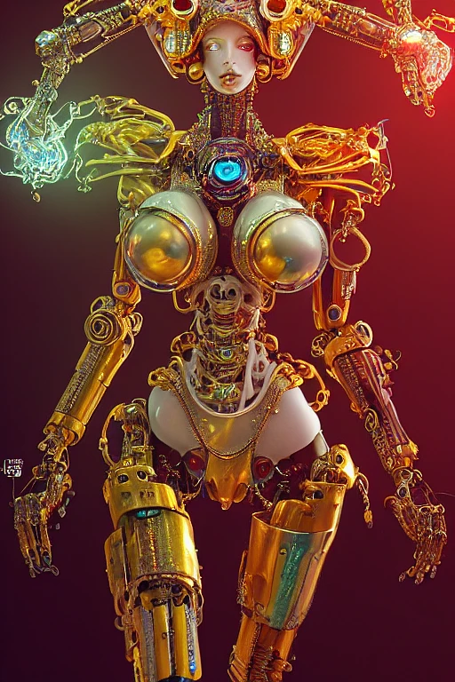 hyperdetailed stunningly beautiful female djinn robot made of iridescent metals and shiny gems, long red hair, golden necklace, noble skeleton inspired by ross tran and wlop and masamune shirow and kuvshinov, concept art, bloody intricate, highly detailed, photorealistic, octane render, 8 k, unreal engine. dnd digital art by artgerm, perfect humanoid