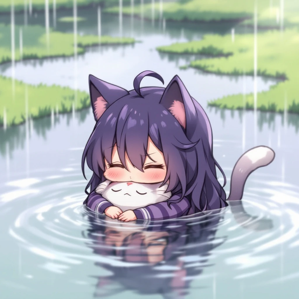 best quality, symmetry, (solo,chibi:1.2) , cat ears, closed eyes, hugging cat, (partially submerged:1.4) , dark purple wavy long hair, (wet:1.1) , outdoors, landscape, scenery, (reflective water:0.9) , <lora:hyperrefiner_v090:1.0>