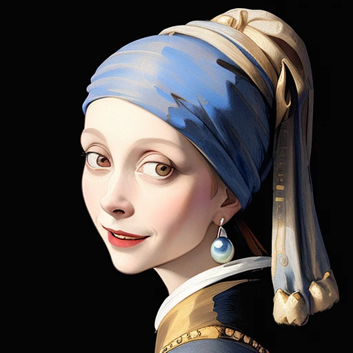 drawing of a woman with a pearl earring as an anthropomorphic cryptid smiles and happy, meticulous