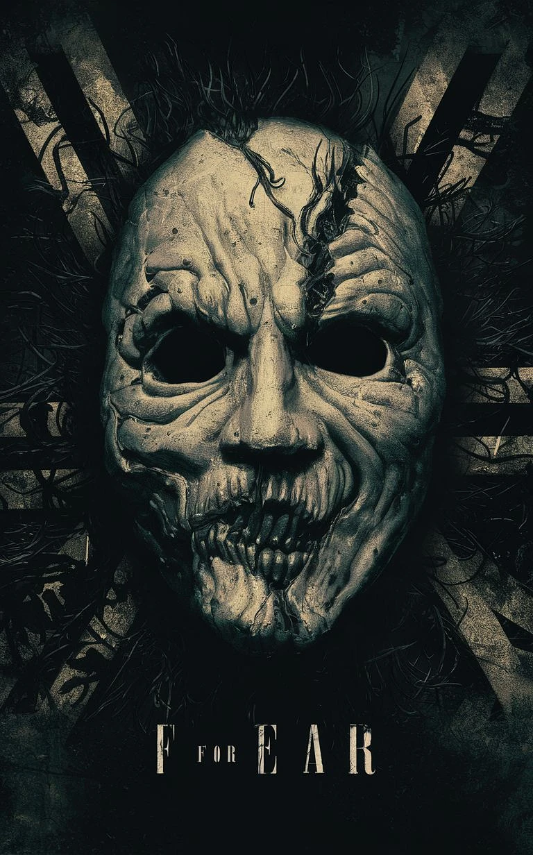 A striking and eerie poster for the film "F for Fear, " featuring the iconic V for Vendetta mask, with the 'V' transformed into a sinister, open mouth. The mask is surrounded by a dark, swirling vortex of unsettling designs, symbolizing the various fears and anxieties that the film explores. The overall atmosphere of the poster is dark and ominous, with a sense of impending doom and terror.