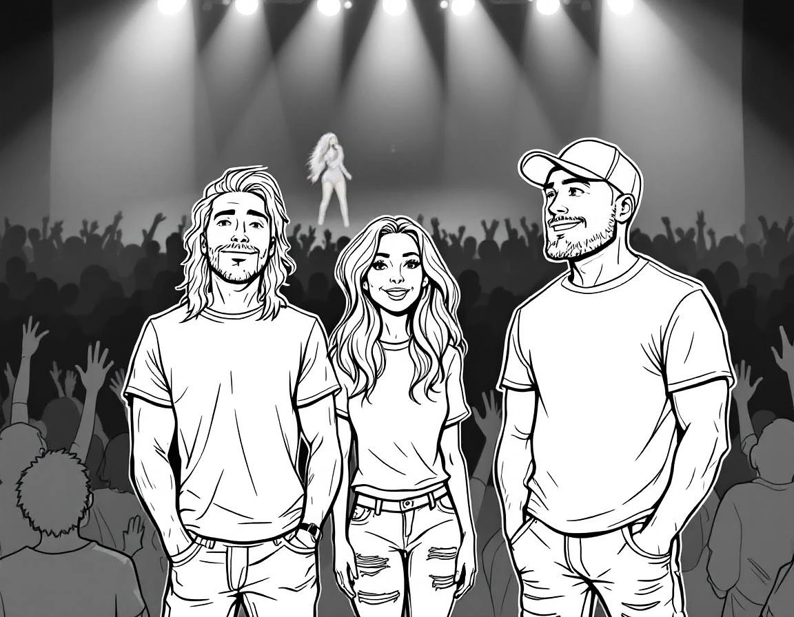 Black-and-white, bold, line art, coloring in page, simple, detailed, sketch. Three friends at a Mariah Carey concert watching her perform live. Mariah is visible on the stage infront of the friends who are in the crowd The woman stands in the middle of the two men. The first man: wearing tshirt and jeans. Long, hair passed his shoulders, underside shaved. Medium-muscled body. Short, neatly trimmed beard. The second man: Wearing a baseball cap, tshirt and jeans. Quite tall with a slightly chubby body. Short, well groomed beard. The woman: Wearing a tshirt and ripped jeans. Wavy, mid-length hair. Shorter than both men. Black and white. Simple. Line art. Detailed sketch. Colouring in page.