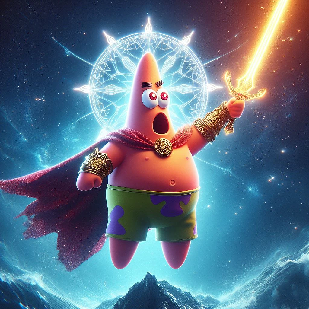 Patricio Estrella is the mightiest god using his sword, red eyes, heroic pose, divine and celestial light, masterpiece, octane render, 8k, raytracing