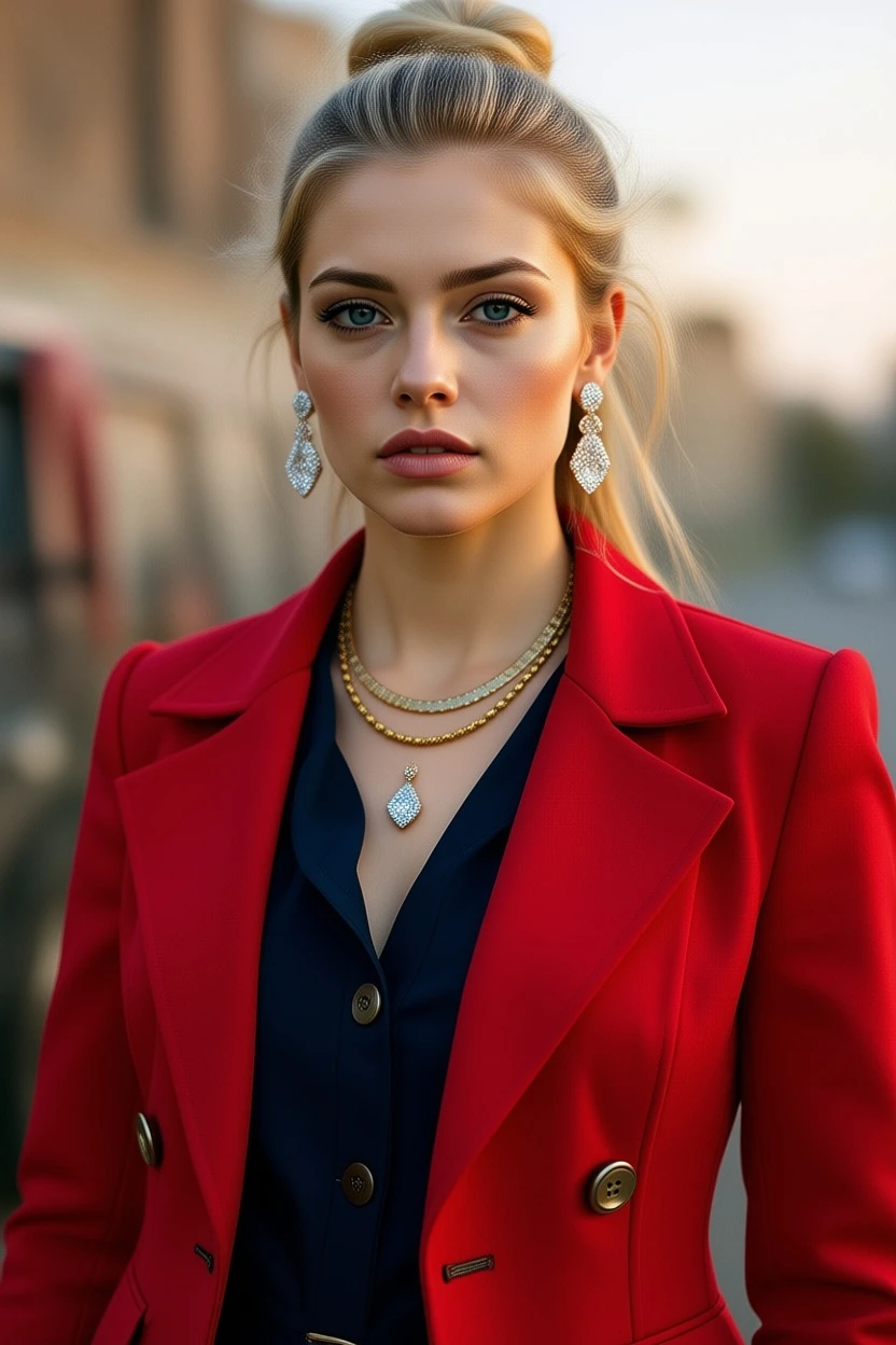 "Close-up full-hight vehicle portrait, Sony A1 50. 1MP, 75mm lens. Fair-skinned supermodel, early 20s, ash blonde hair in a soft bun, striking vivid blue eyes, parted full coral lips, scarlet jacket, navy shirt, diamond statement earrings and necklace accessories. Warm, slightly dark, soft, professional photography, golden hour lighting, soft pastel palette. "