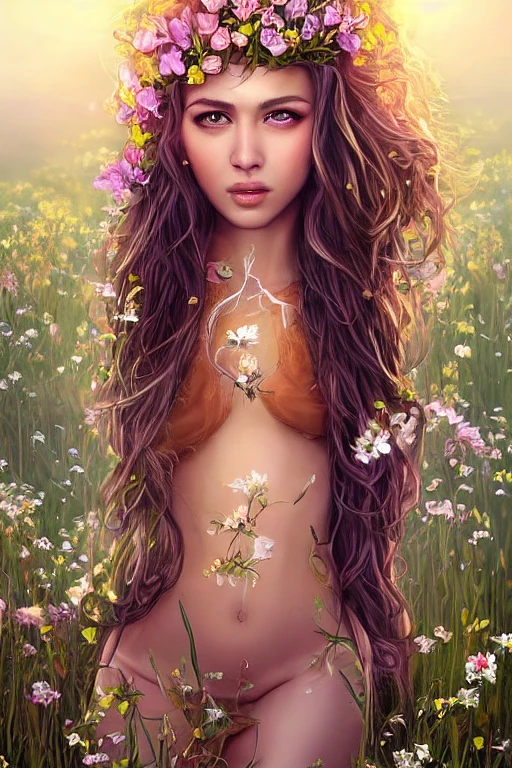 hyperrealistic full length portrait of gorgeous goddess | standing in field full of flowers | detailed gorgeous face! ! | full body! ! | skimpy armor | god rays | intricate | elegant | realistic | hyperrealistic | cinematic | character design | concept art | highly detailed | illustration | digital art | digital painting | depth of field