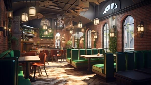 Cozy café with a vintage design, cozy seating areas, and brick facade, inspired by Norman Foster, painted by Ray Collins --ar 16:9 --c 3 --v 5. 1