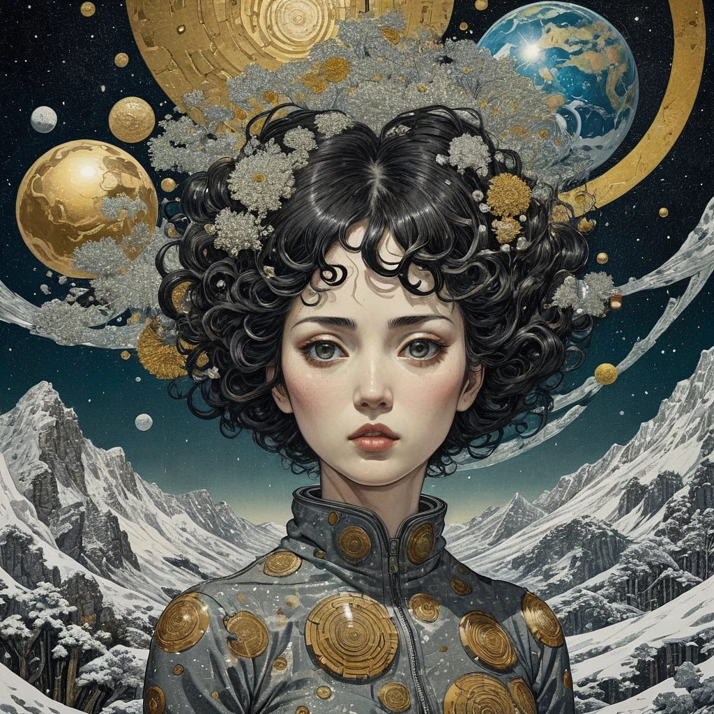 surreal collage art crafted , order vs chaos, sense vs no sense, male vs female, good vs bad, vintage vs futuristic, cinematic, art by Yuko Shimizu , art by Gustav Klimt