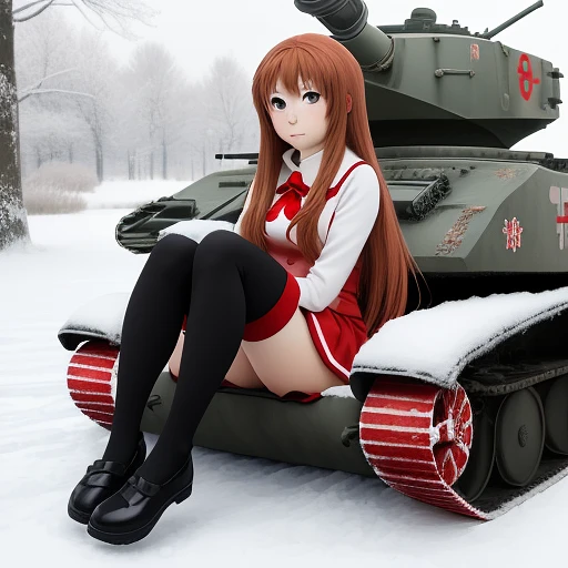 taiga aisaka, anime, red school uniform, long hair, sit on tank, frosty, not realism, cartoon, art, feet, black stokings, black thigh highs, anime face, anime eyes, black shoes, winter, snow.