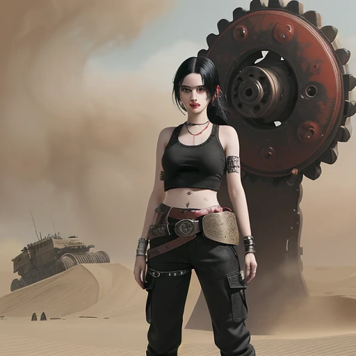 absurdres, highres, emo girl_ (Black Hair with red streaks) , Red Eyes, post apocalyptic mechanical wasteland, sand dunes, ancient machinery, giant gears, cogs, bolts, sandstorm, dystopian, cargo pants, tank top, bandana, belt, straps, buckles, leather bands