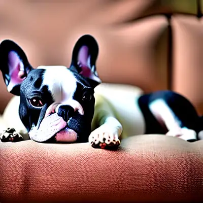 highly realistic high resolution photo of a French bulldog of white and black colors on a sofa