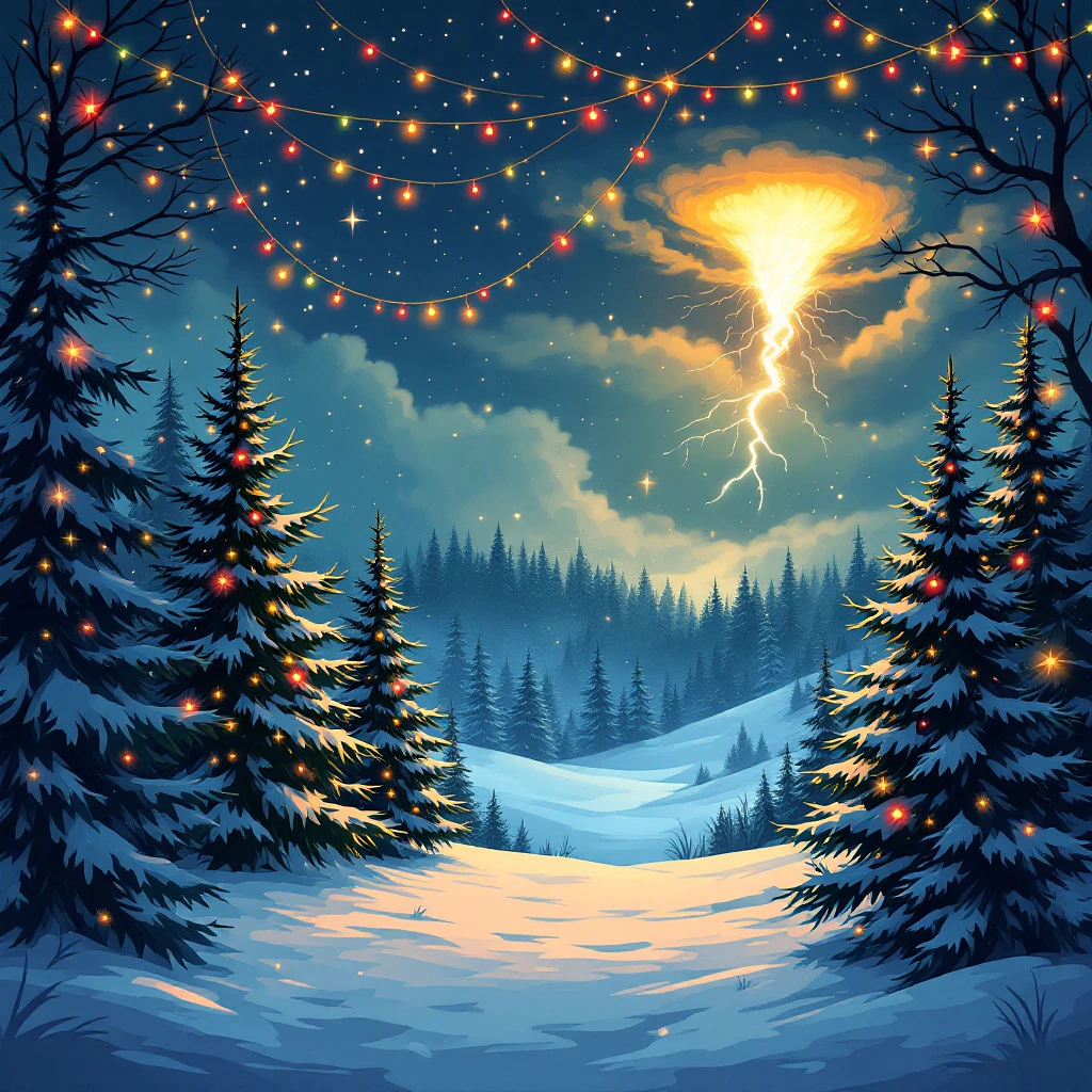Christmas night background with christmas tree silhouettes, garland decoration vector illustration. happy new year card design. orange and yellow color scheme, storm snow blizzard with tornado and lightning in background. Flat style cartoon vector, orange shadows, dark red shadows, bright yellow shadows, --ar 1:1