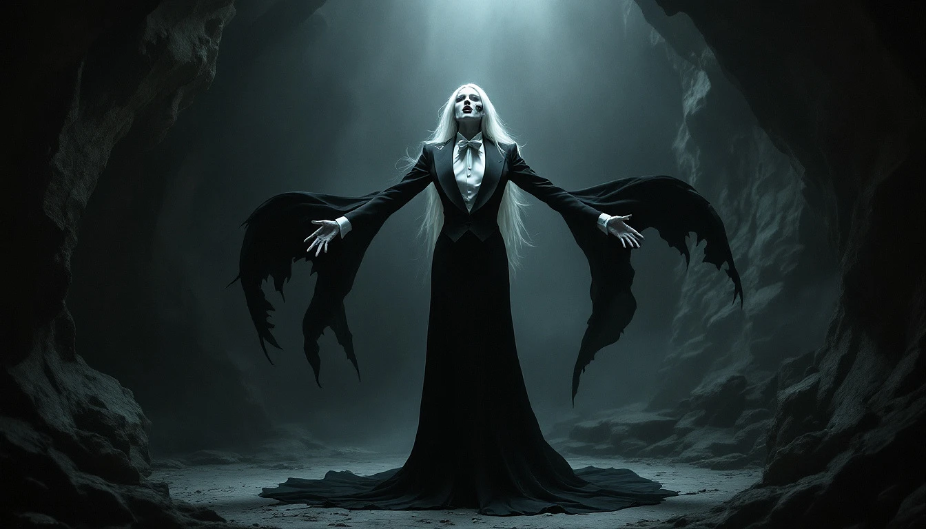 phantom of the opera, Woman, tall, slender, long legs, long white hair, right side of face is severely scarred, she wears a fitted tuxedo, white shirt and white bow tie, long flowing black skirt four inch black stilettos are visible, she sings in an operatic style, arms wide, in a gothic lair , cave with a large pipe organ. extreme wide to show entire body. A handsome man in nineteenth century formal wear stands ten feet behind her mesmerized by her singing.