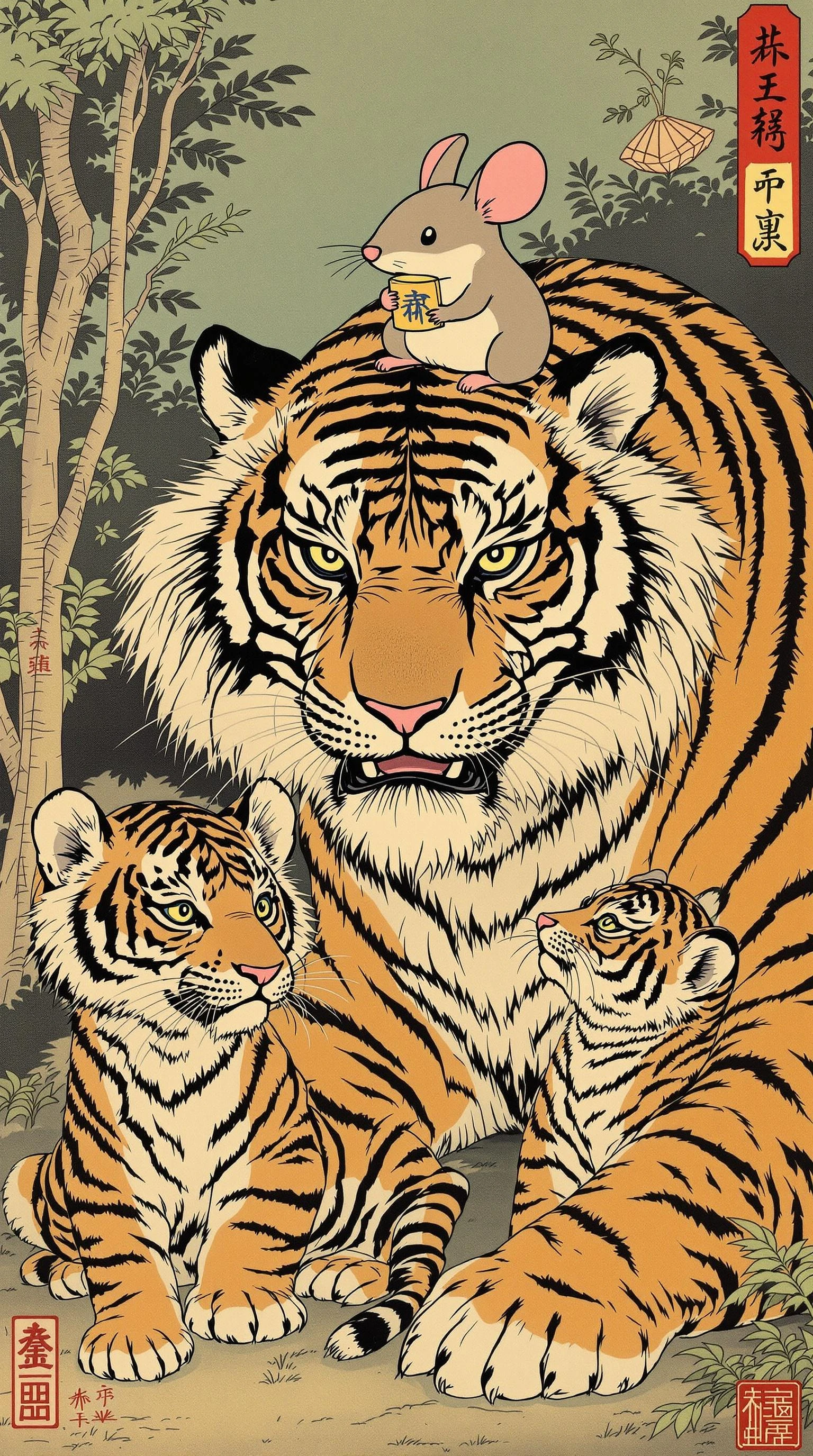 a tiger and two tiger cubs, and a oversized mouse , with a mouse on the tiger's head, the mouse holding a talisman, Japanese Ukiyo-e