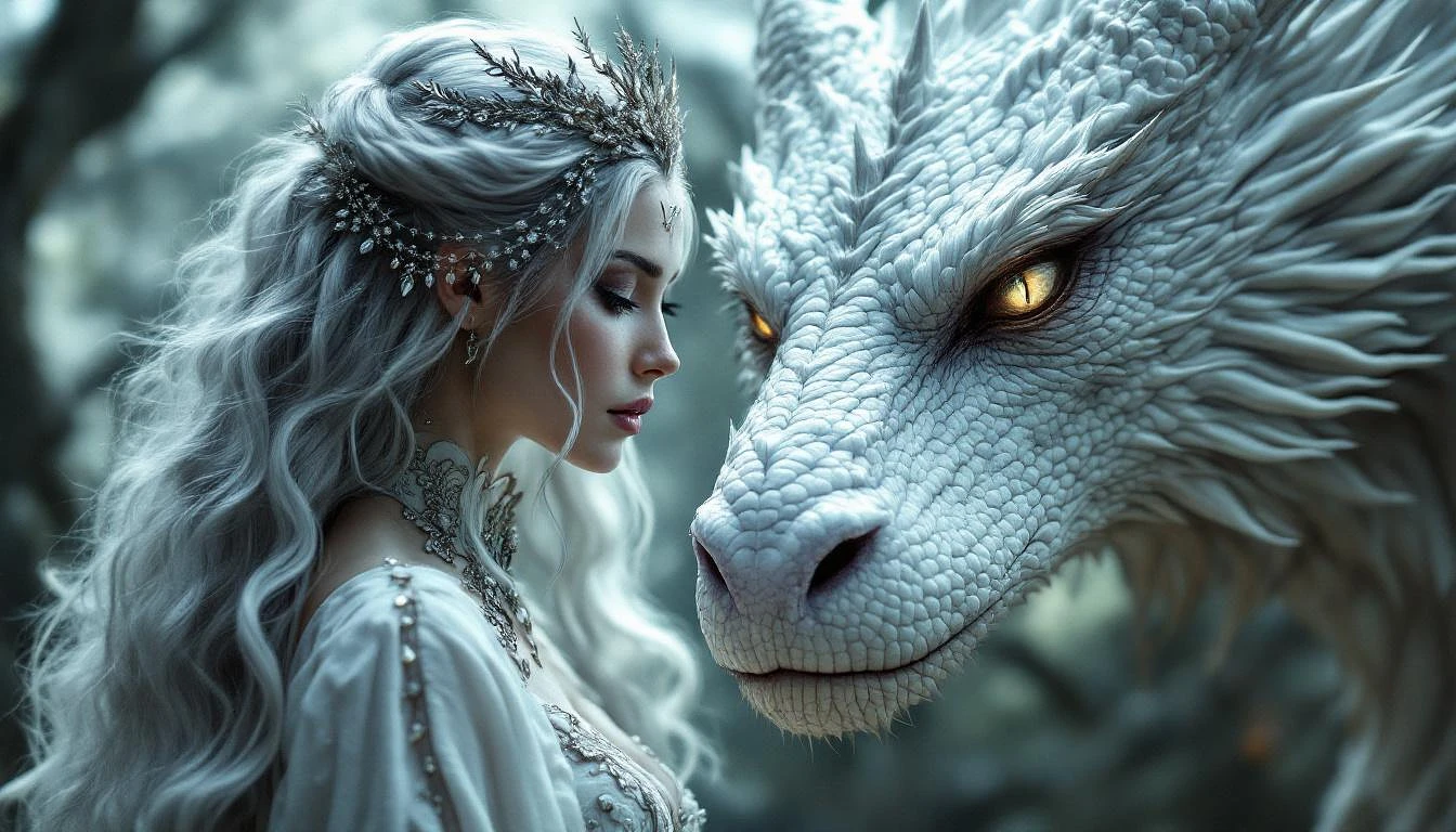 A fantasy scene featuring a woman with long, wavy, silver hair adorned with a delicate crown and intricate, ornate clothing. She stands near a large white dragon with a detailed, scaly texture and glowing orange eyes. The dragon's head is positioned close to the woman's face, creating an intimate and mystical atmosphere. The background is a blurred forest setting. Inspired by Nína Tryggvadóttir