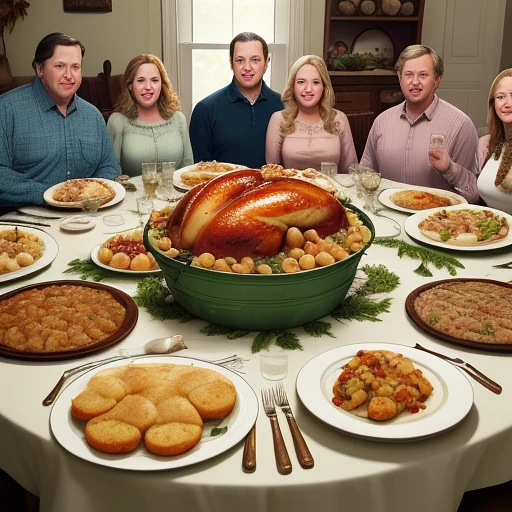 “A very large southern family sitting around the dinner table, brothers and sisters, cousins and in-laws, all at thanksgiving, table has many varieties of southern style foods including, but not limited to, a turkey, a ham, green beans potatoes and several desserts”