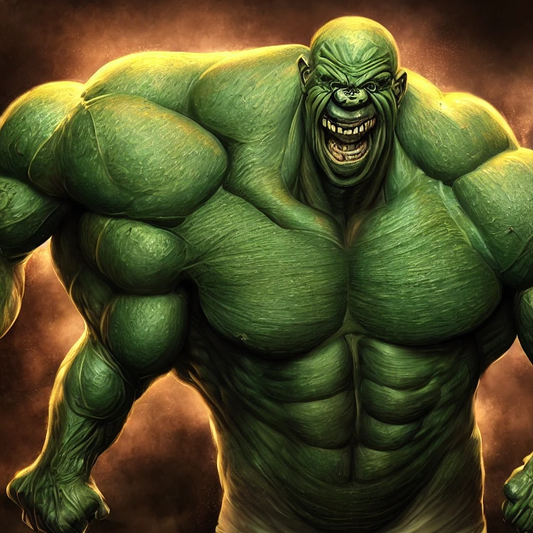 Realistic concept art of an enormous vascular bulging muscular hot orc monster with green skin smiling and massive bulging veiny pecs and bulging veiny biceps breaking a building while posing his vascular muscles huge inner pecs bulging bulk psysique bald, flensing muscles gym background, 4k, extreme quality, very detailed, side lighting