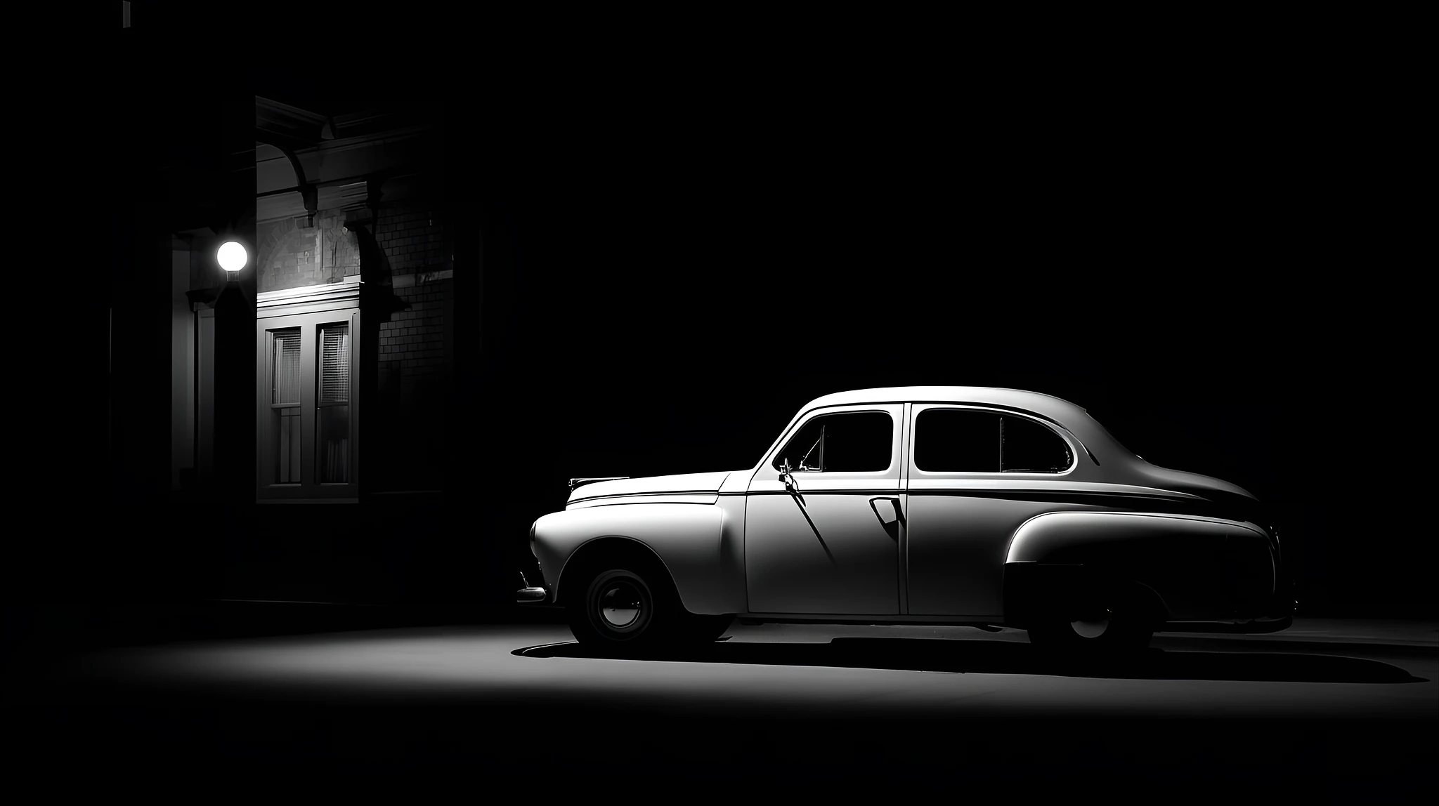 backlit photography, a classic car under a streetlamp, the light creates a dramatic shadow pattern, glowing edges, striking contrast, elongated shadows, atmospheric glow, city street, elongated shadow effects, balance of light and dark, romance, twilight, romanticism, shot on leica m10, standard lens, low angle view, dorothea lange style, muted colors, impressionism, soft glow bokeh, dreamy, nostalgic, classic, streetlamp, muted, soft