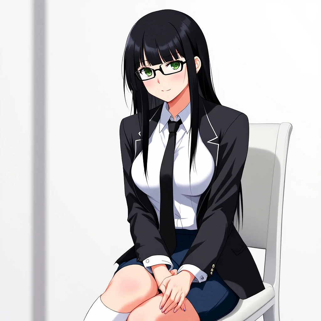 anime, woman, black hair, long hair, straight bangs, green eyes, black glasses, white shirt, black tie, black blazers, dark blue skirt, white socks, black shoes, sitting on a chair, sitting with legs crossed