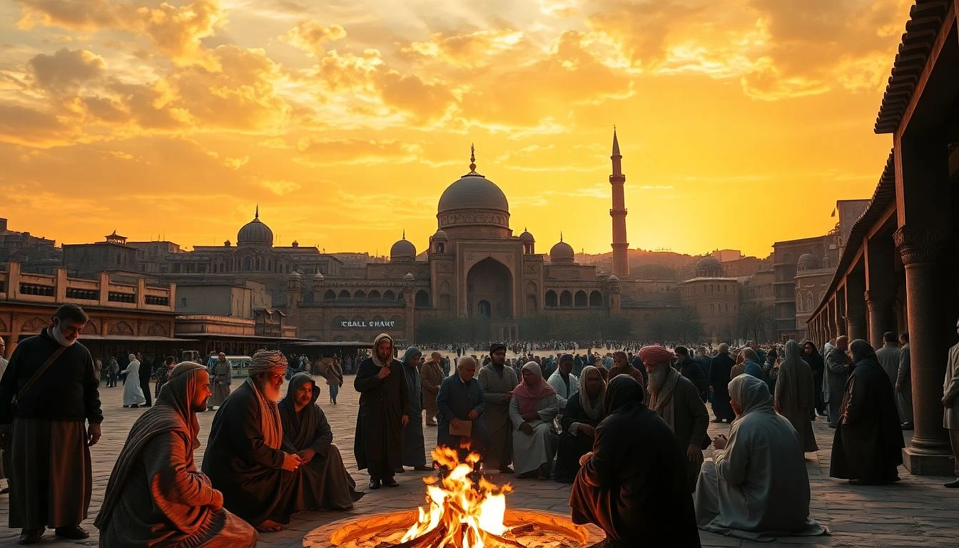 a wide-angle photograph of a bustling marketplace in an ancient city, captured with a high-quality camera that emphasizes the intricate details of the scene. The foreground features a group of people gathered around a fire, with some sitting on the ground and others standing nearby. The individuals are dressed in traditional attire, including long robes and head coverings, with some wearing turbans or other headpieces. The people's faces are not clearly visible, but their body language suggests they are engaged in conversation or enjoying each other's company. The background of the image reveals a stunning cityscape with multiple buildings, including a large central structure with a prominent dome and minaret. The buildings are adorned with intricate architecture, including arches, columns, and ornate details. The sky above is a deep orange and yellow, with clouds scattered throughout, adding to the warm and inviting atmosphere of the scene. The lighting in the image is soft and warm, with the setting sun casting a golden glow over the entire scene. The image appears to have been captured with a high-end digital camera, possibly a DSLR or mirrorless model, with a wide-angle lens (between 10-24mm) to emphasize the expansive nature of the scene. The camera's sensor and lens combination have produced a high level of detail and clarity, with minimal noise or distortion. The photographer has employed a shallow depth of field, blurring the background slightly to draw attention to the people in the foreground. The overall style of the image is reminiscent of traditional Middle Eastern or North African architecture and culture, with a focus on capturing the vibrant atmosphere and community spirit of the marketplace.