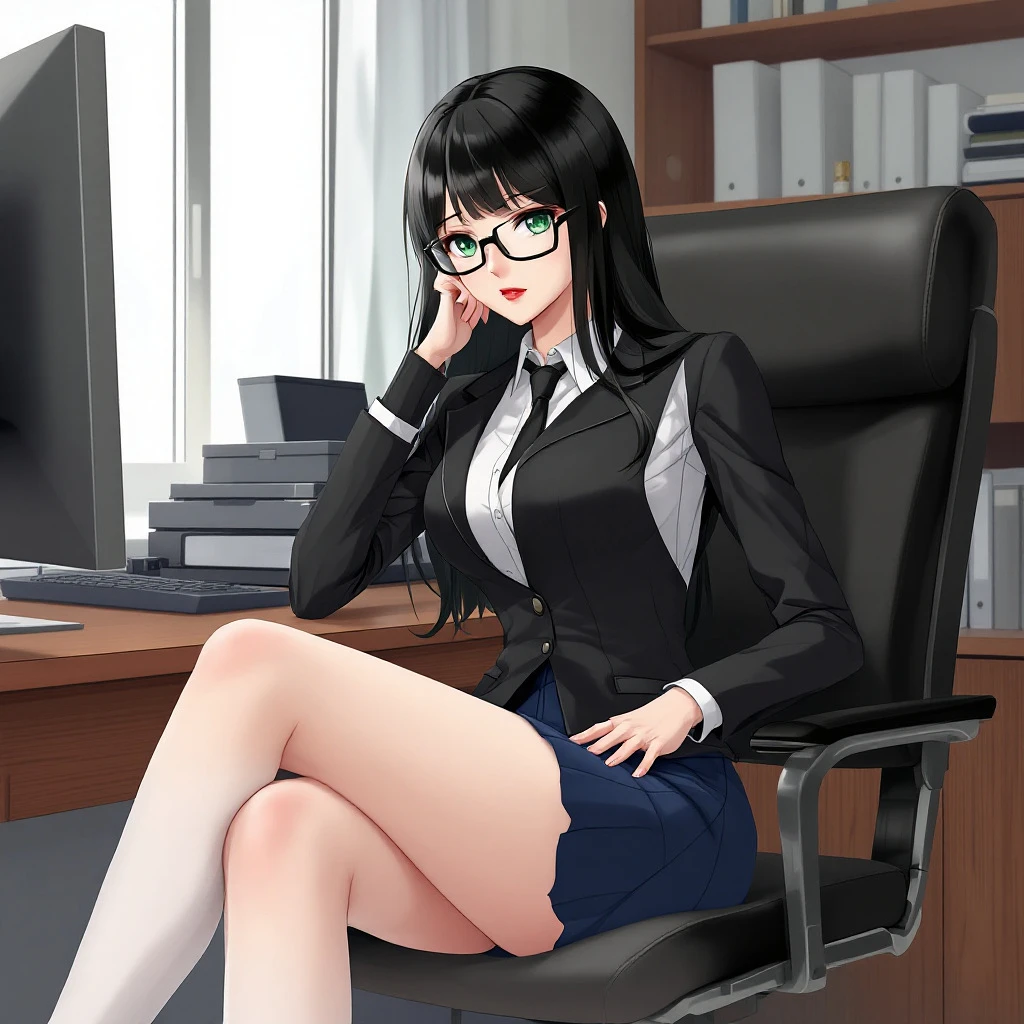 anime, woman, black hair, long hair, green eyes, black glasses, red lips, white shirt, black tie, black blazers, tight blazers, short dark blue skirt, highschool skirt, white long socks, black shoes, at an office, bored expression, big chest, sitting on a chair, sitting with legs crossed, skinny belly