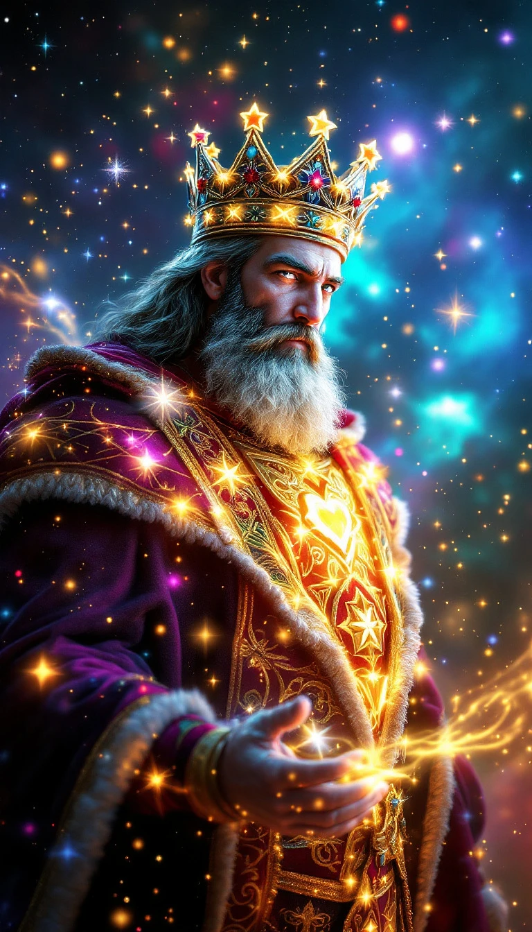Witness the extraordinary transformation as the King of Hearts card comes to life as a 3D hologram, embodying the essence of cosmic energy. As the King emerges, you are transported on a journey through the universe, with stars and galaxies swirling around him in a mesmerizing display. The King's attire, adorned with celestial patterns, and his glowing star cluster crown, add to the otherworldly charm. This hologram, floating against a backdrop of shifting cosmic scenes, from vibrant nebulae to enigmatic black holes, creates an immersive and futuristic atmosphere. Perfect for space-themed events, science fiction conventions, or futuristic tech expos, this visual spectacle is sure to leave a lasting impression, blending fantasy and technology in a unique and captivating way.