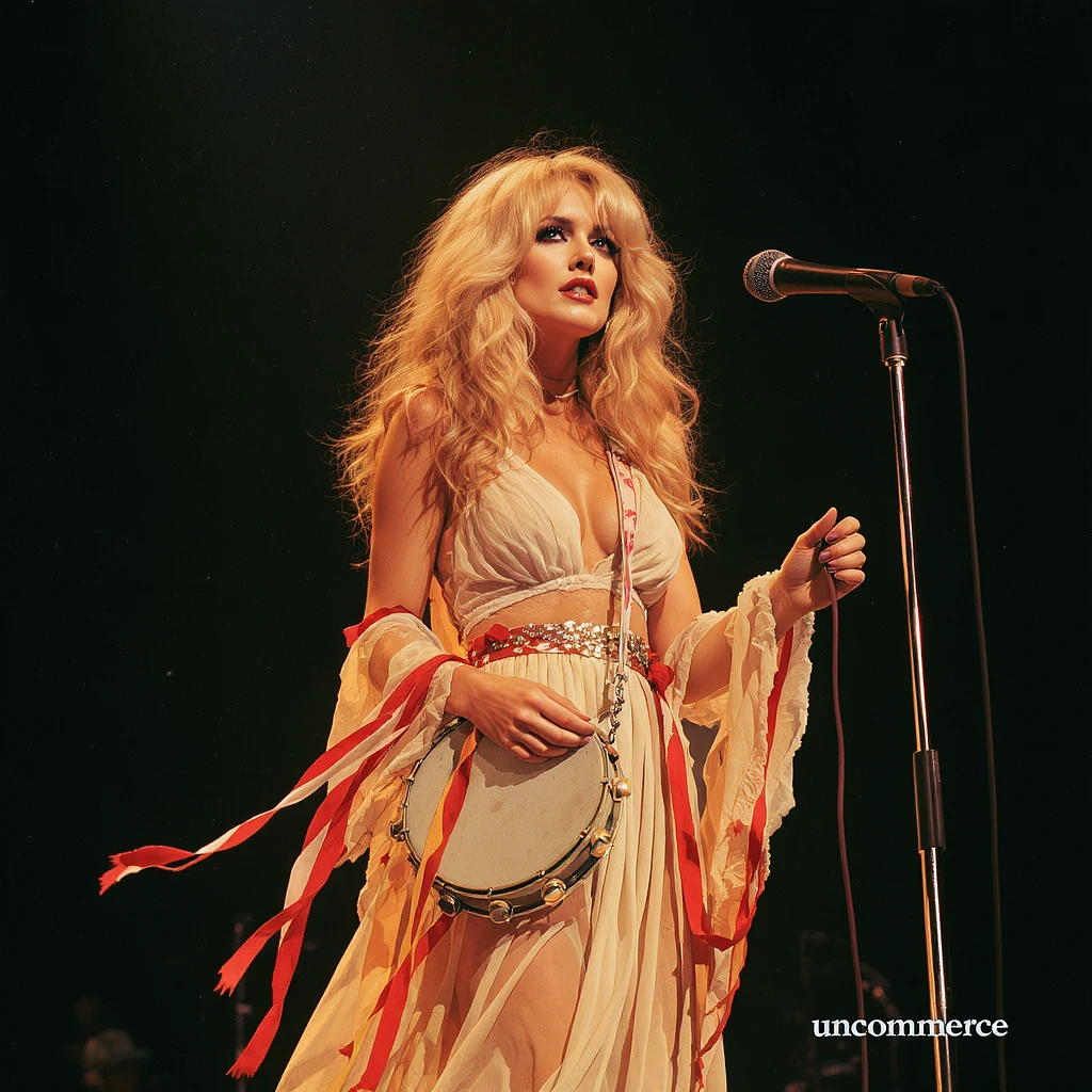 Stevie Nicks performing on stage with Fleetwood Mac, ethereal bohemian style, flowing chiffon dress, layered scarves, tambourine with ribbons, long wavy blond hair, husky and intense expression, warm golden stage lighting, 1970s vintage rock concert photography, cinematic composition, ultra realistic, high detail, 35mm film grain, slight lens flare, subtle small white text "uncommerce" in elegant serif font at the bottom right corner --ar 16:9 --v 6 --style raw