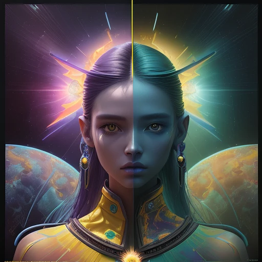 3 d, sci - fi, prismatic sun rays beautiful stunning fashion model face, yellow faces, cinematic, vogue cover style, poster artistic purple and deep turquoise blue mood, realistic painting, intricate oil painting, high detail, figurative art, multiple exposure, poster art, 3 d, by tooth wu and wlop and beeple and greg rutkowski --q 2 --v 5 --ar 3:4