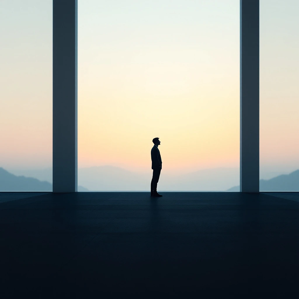 contemporary, minimalist, wide, one subject, centered, digital illustration, wide angle, head-on, low contrast, solitary man in silhouette, mid-thirties, dressed in a simple, modern outfit, his posture relaxed and introspective large, softly lit space with gradients of navy and soft white, environment is sparse and open, emphasizing solitude and contemplation, soft gradient from warm tones, creating a tranquil and ethereal atmosphere focus on the subtle interplay of weak light and shadow on the subject and surroundings, focus on texture and ambient light --ar 9:16 --style raw --v 6. 1
