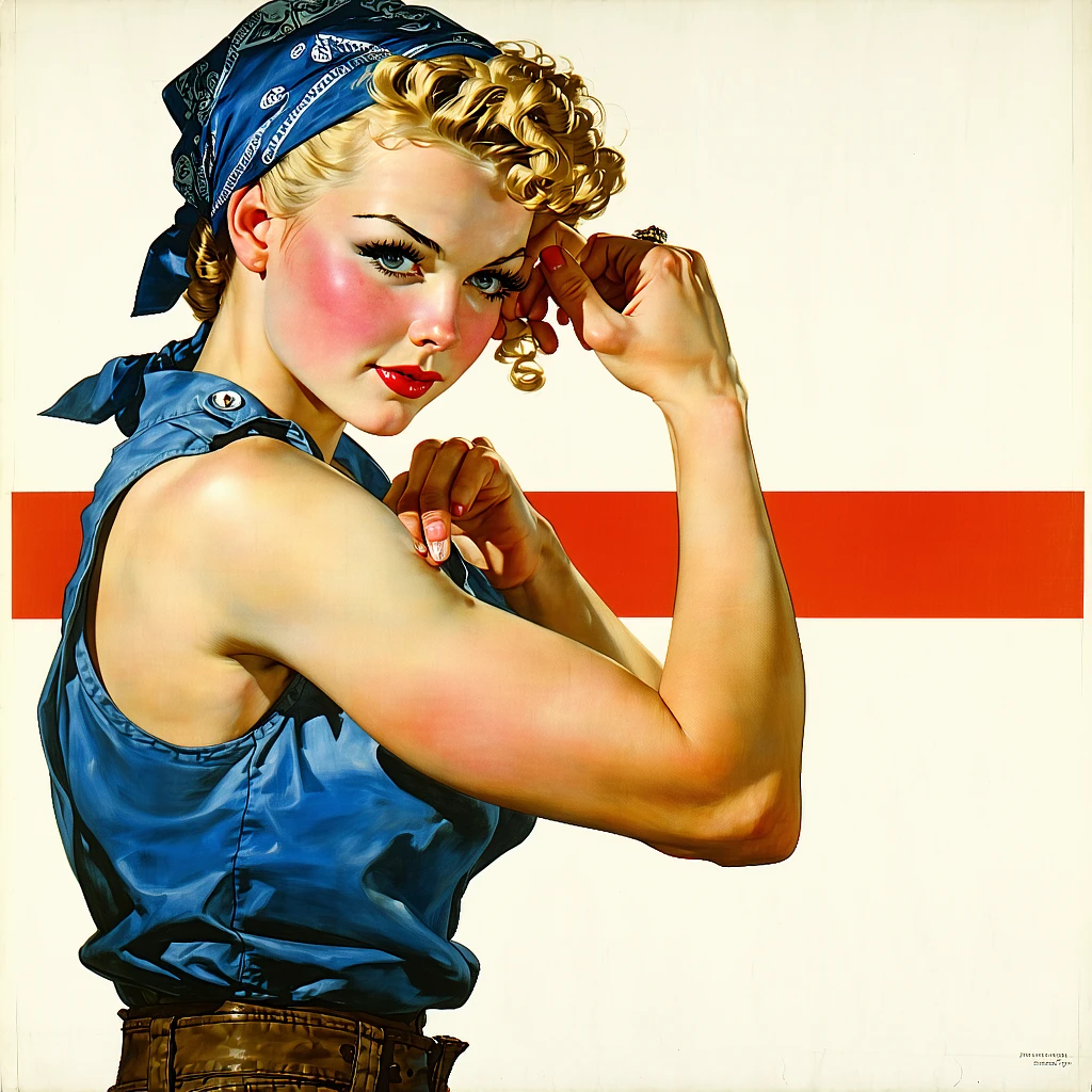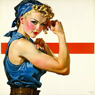 Cover art quality illustration by ((Joseph Christian Leyendecker) ), a Rosie the Riveter, 3/4 shot, from the side, candid, looking away from the viewer, blond curly hair, horses tied with a blue bandana, light-blue eyes, fair complexion, full lips, deep plunging neckline, dirty carpenter pants, Art Deco bas-relief illustrating the Union Jack flag, 1920s fashion, high quality, vintage illustration, emotional, classical, backdrop lighting, ((well-drawn hands) ), accurate fingers, ((no extra fingers) ), well drawn limbs, no mutated limbs, intricate details, ((no animal) ), ((no horse) )