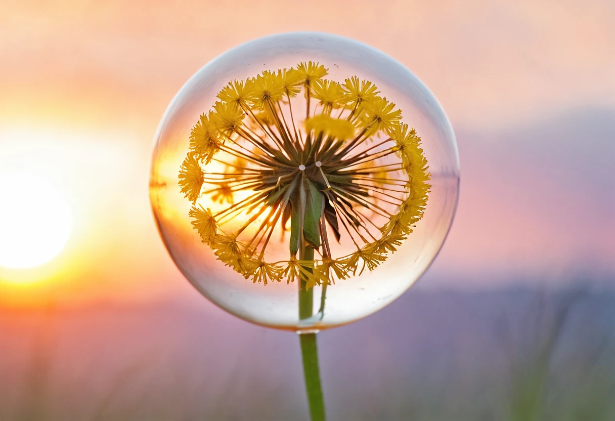 by David Mann, Anne Geddes, 3d blender render, divisionism, close up of a (dandelions with a gas sphere:1.1) , Tiny, wearing Charred nude, One Hand in Pocket, inside a 1960'S Tanzania, at Sunrise, Realistic, double exposure, Kodak Portra 160, Low shutter, Autochrome