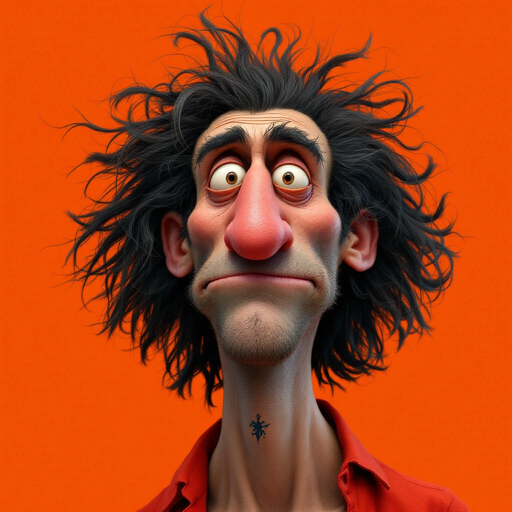 A caricature of a man with exaggerated features is set against a vibrant orange backdrop. His skin is rough and textured, his nose large and reddish, and his thick, dark hair wildly disheveled, as if caught in a strong wind. He has a weary, almost bored expression, with heavy eyelids and a downturned mouth. He wears an open-necked, red shirt. A small, stylized tattoo is visible near the base of his elongated neck. The overall impression is one of a world-weary, slightly disreputable character. ] [3D caricature, stylized portrait] [Inspired by the character designs of artists like Alberto Mielgo or Carlos Grangel, with a focus on exaggerated proportions and expressive details.] [3D render with realistic textures and lighting. The orange background provides a strong contrast to the character's dark hair and the subtle details of his skin. The lighting is directional, likely from above, creating shadows that accentuate the character's features. The overall style is humorous and slightly grotesque
