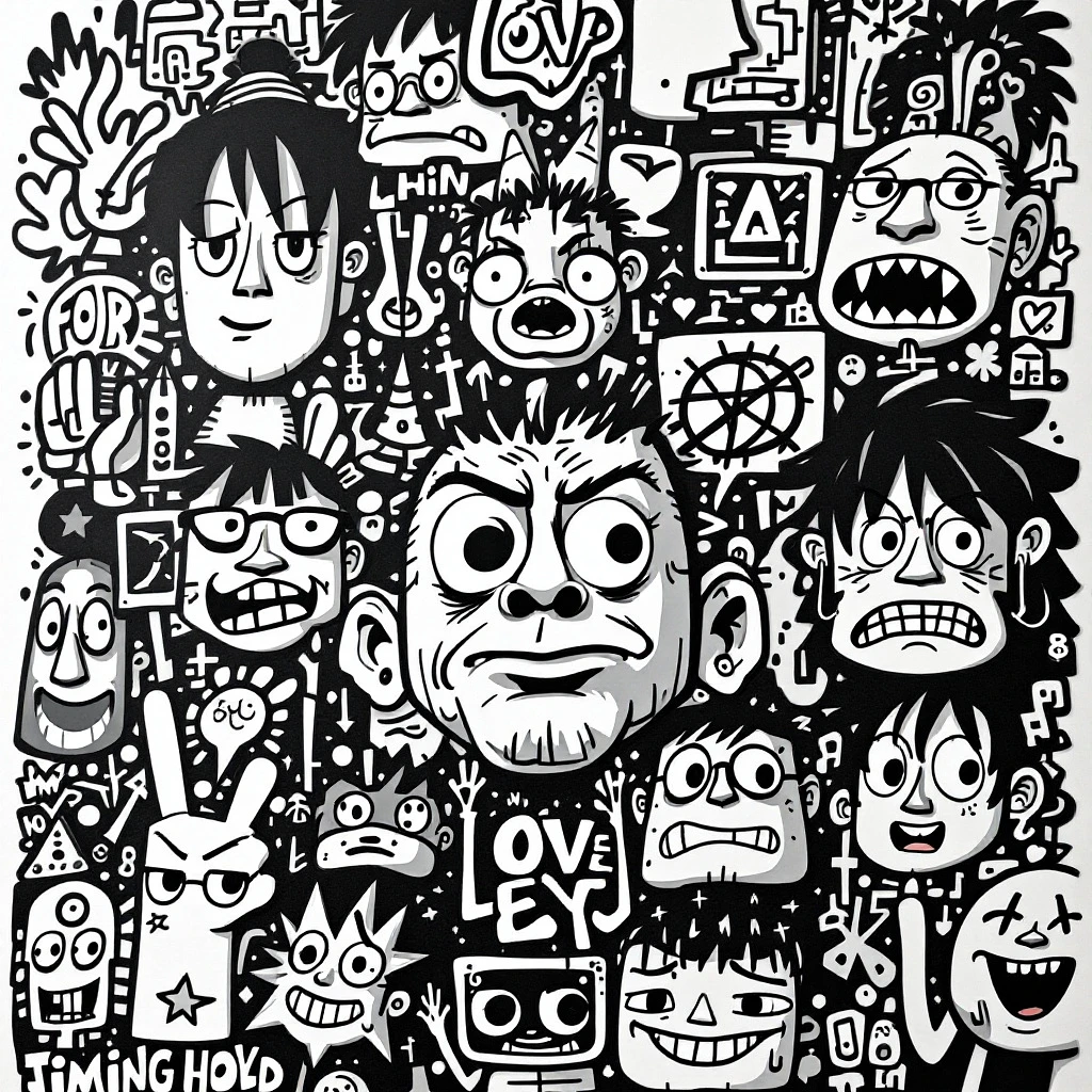 An intricate and mainly black and white, just two other colors for details, graffiti-style poster featuring various elements, such as cartoon characters, symbols of urban culture, and dynamic expressions, focusing on minimalistic faces --ar 63:128 --stylize 750