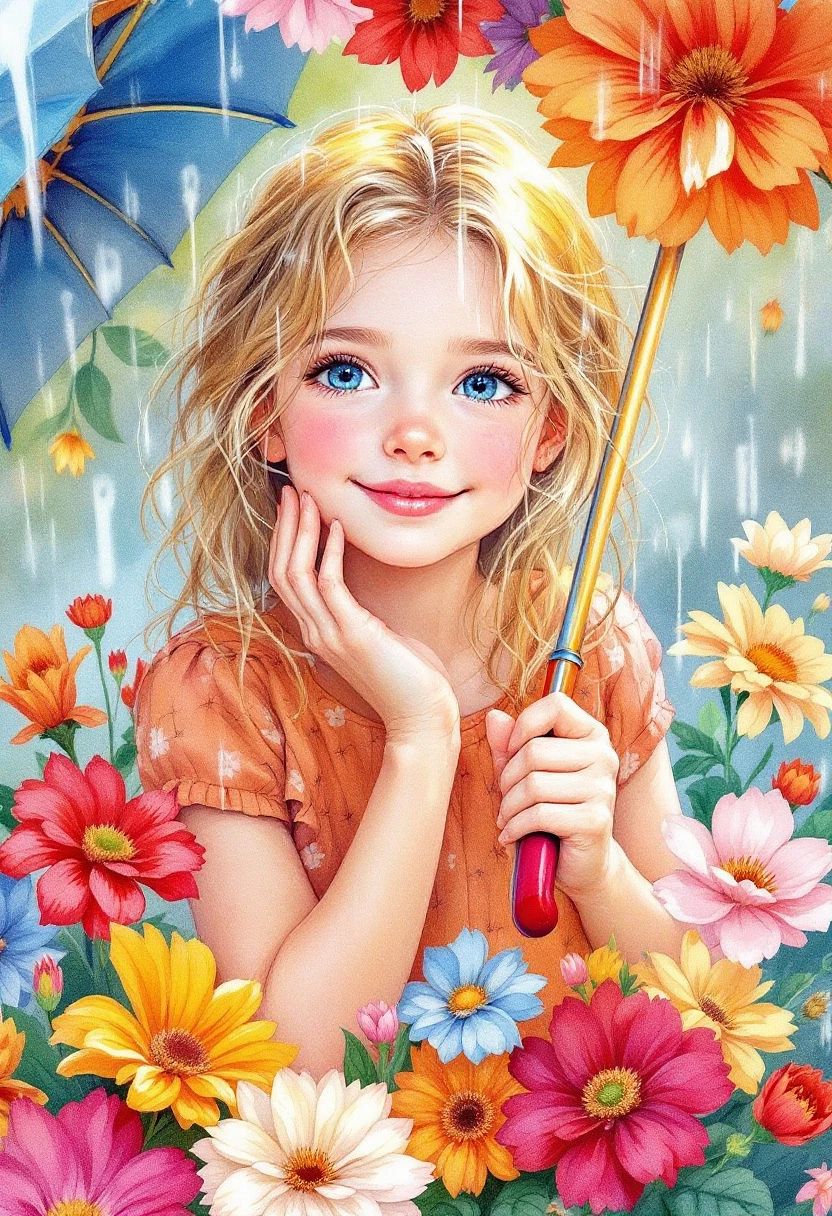 Sketch, Beautiful Colored Pencil Line Art, Beautiful Curves, Brush Technique, Artistic, Beautiful, 5-Year-Old Chubby, Cute, Blonde Hair, Rainy Season, Image of a Cute Girl with an Umbrella, Surrounded by Colorful Flowers, Expressing Emotions in a Beautiful Line Drawing Style, Perfect Composition Impressive Details and Beautiful Rendering, Trending on ArtStation, 8k Art Photography, Realistic Conceptual Art, Perfect Light in Natural Volumetric Filming, Soft Light and Shadows, Award Winning Photography, Masterpiece, Oil on Canvas, Raphael, Caravaggio, Greg Rutkowski Beeple, Beksinski, Giger